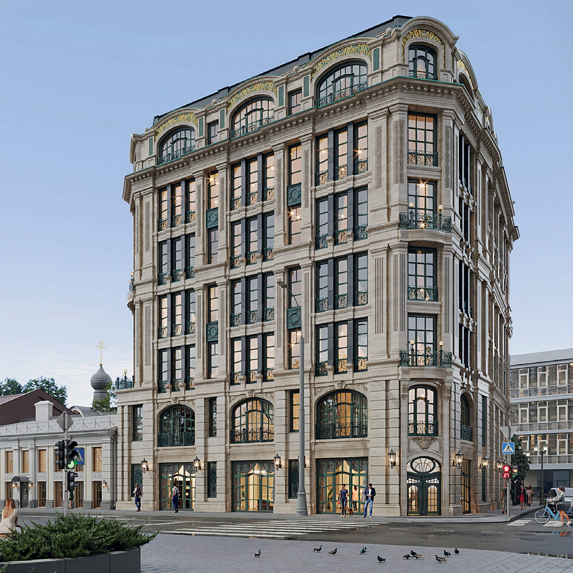На первом этаже расположены коммерческие помещения с панорамными окнами и высоким потолком — идеальное место для бутиков или кафе. Архитектура здания, выдержанная в лучших традициях французского стиля, подчёркивает премиальный статус резиденции. Это проект для тех, кто ценит эстетику, качество и близость к культурному наследию столицы.