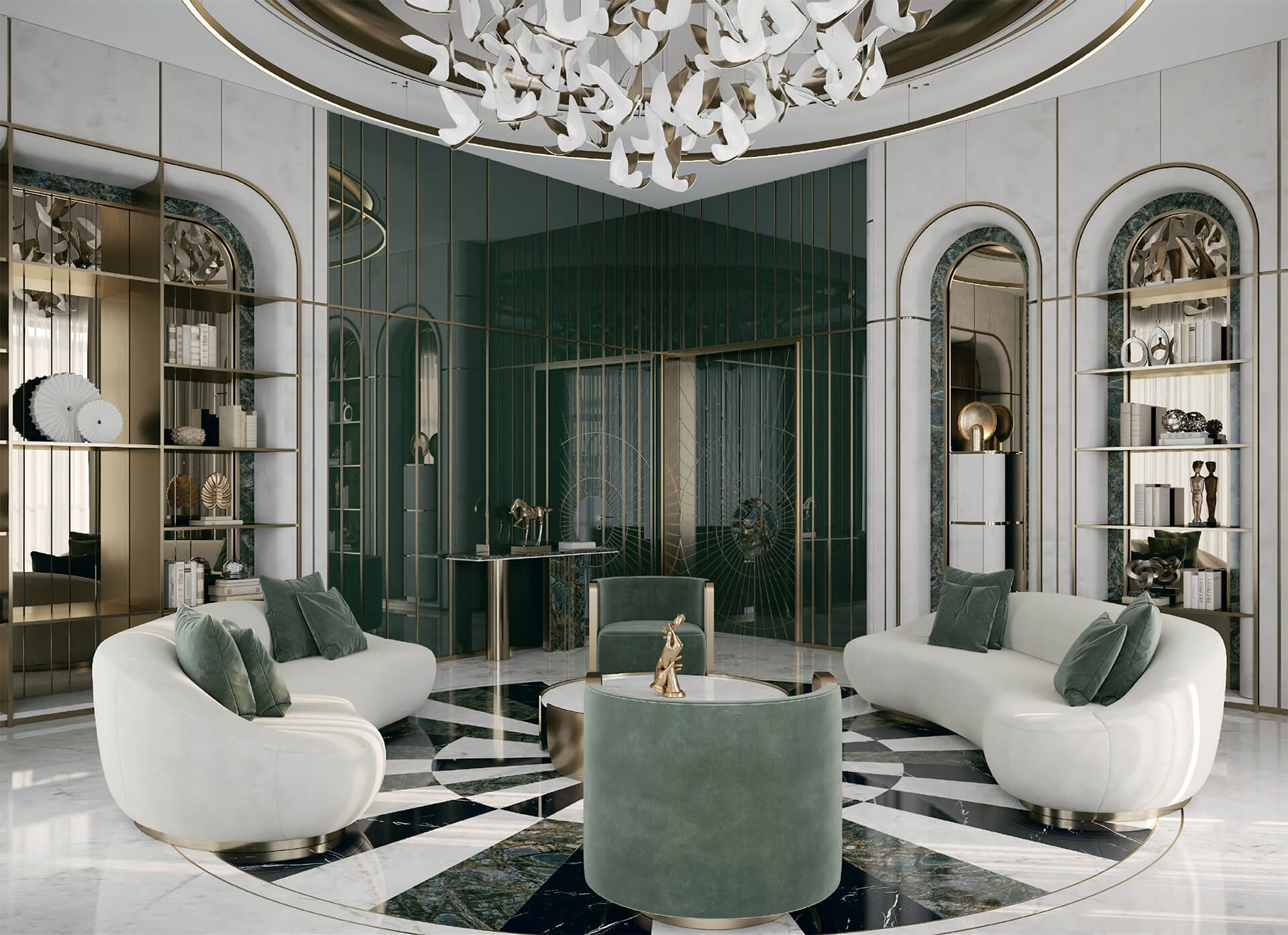 Интерьеры лобби и общих зон выдержаны в эстетике утончённого стиля, подчеркивающего атмосферу респектабельности с первых шагов в доме. Высокие потолки — 3,9 метра — создают эффект пространства и наполненности воздухом, а тщательно подобранные материалы придают помещению статусный облик.