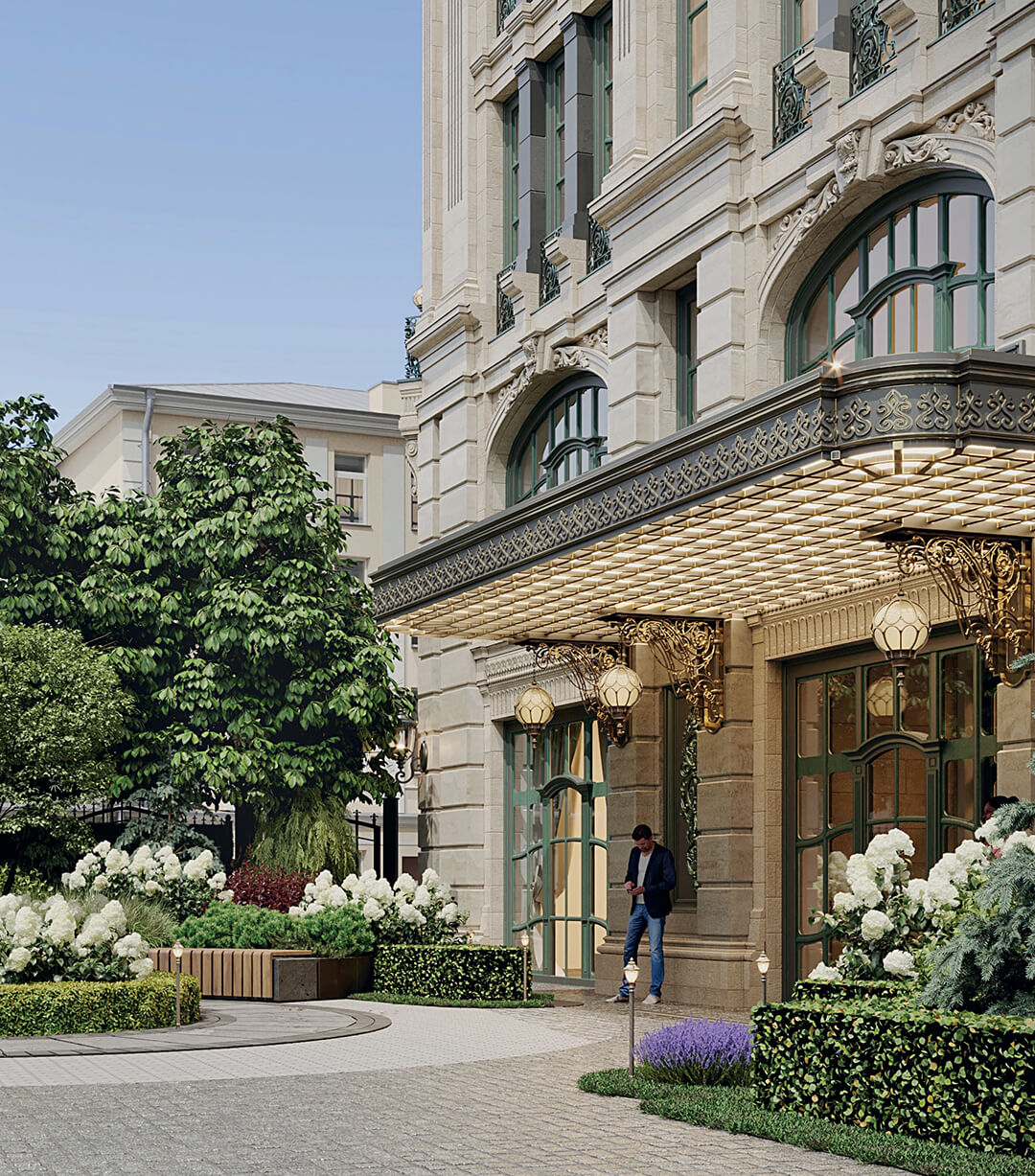Каждая деталь экстерьера продумана до мелочей: от высоких арочных окон до строгой цветовой палитры, создающей визуальную лёгкость. Здание гармонично вписывается в исторический облик Большой Полянки, придавая ей современное звучание с нотами парижского шарма.