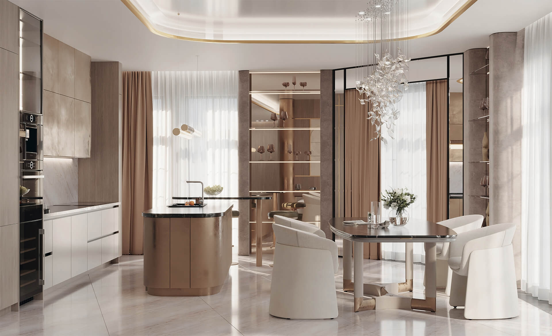Интерьеры лобби и общих зон выдержаны в эстетике утончённого стиля, подчеркивающего атмосферу респектабельности с первых шагов в доме. Высокие потолки — 3,9 метра — создают эффект пространства и наполненности воздухом, а тщательно подобранные материалы придают помещению статусный облик.