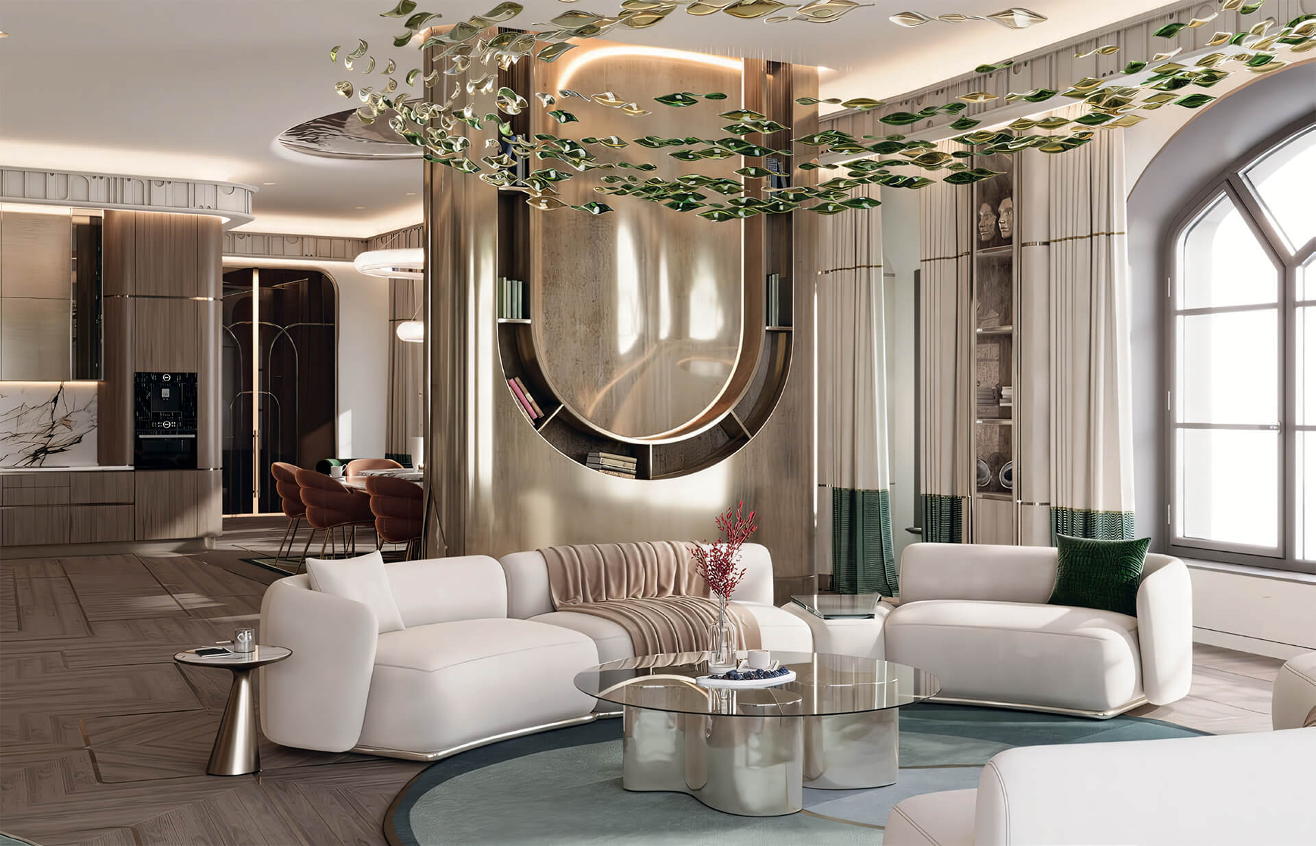 Комната ожидания и лифтовый холл оформлены с особым вниманием к деталям, где каждая текстура и линия подчеркивает изысканность и комфорт. Большие окна обеспечивают достаточное количество естественного света, что делает зону лобби особенно уютной и привлекательной.